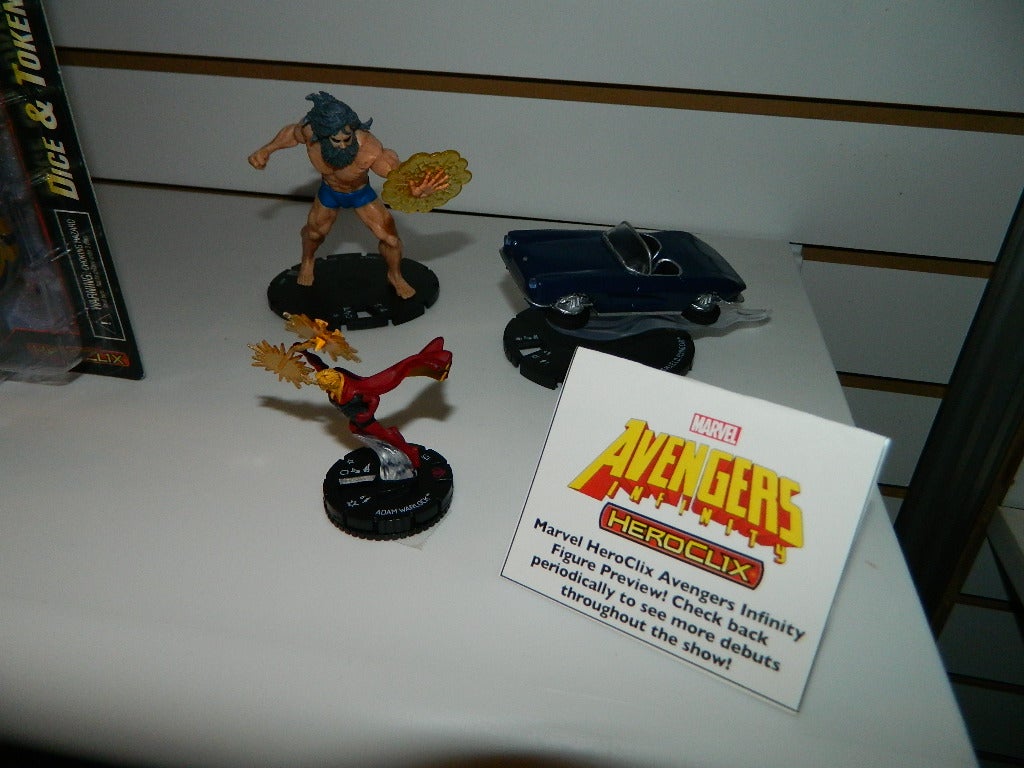 On the Marvel side of things WizKids was showing off figures from Avengers Infinity due out in May! This set has large booster boxes with 2×2 based figures and vehicles plus regular-sized figures, and on hand were Adam Warlock, Ego-Prime, and a S.H.I.E.L.D. flying car. We got looks at the sides of the booster box so we know the set will include classic Guardians of the Galaxy characters in their first appearances, the original Infinity Watch, the Living Tribunal, classic Avengers, and vehicles and colossals featuring Devil Dinosaur and the Spider Buggy. Also on hand was the Fast Forces pack for the set and the Dice & Token pack which will have the individual Infinity Gems on the back of the Infinity Watch tokens!