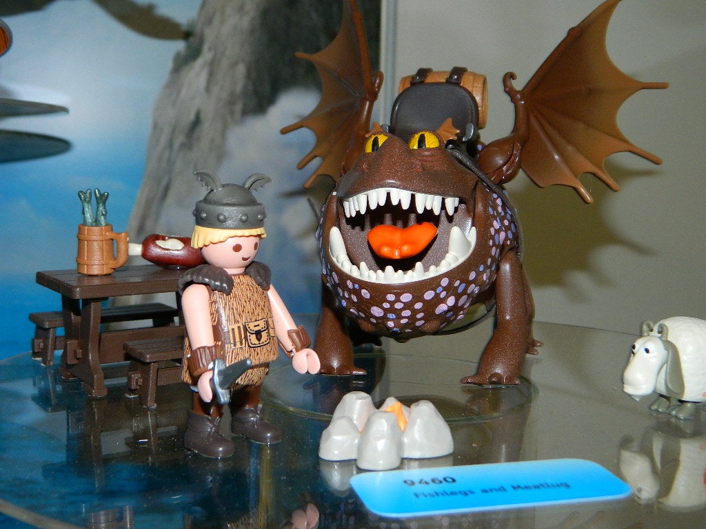 Dragons: Coming from the DreamWorks television series and the How To Train Your Dragon films is the continuing series of Playmobil toys. Due out in late summer are three new dragon toys that were on display with early prototypes, each of which will come with its rider or riders. There’s also a really neat Sheep Sling set that really shoots sheep!