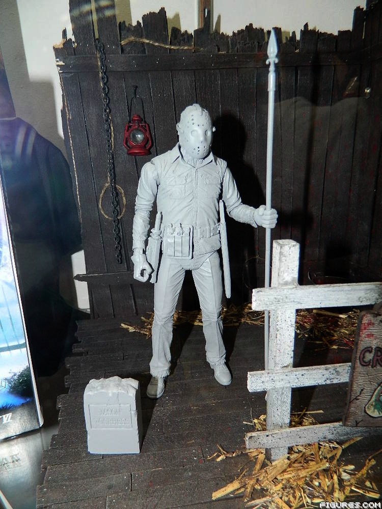 REVIEW: NECA Mego-Style Friday the 13th - JASON LIVES You Can't Keep A Good Slasher Down... CLICK HERE FOR MORE PHOTOS OF NECA'S MEGO-STYLE JASON LIVES ACTION FIGURE! Everyone has their favorite Jason Voorhees from the Friday the 13th films. Some fans enjoy the early "Sack Head" Jason from Part II, while others prefer his Jason X appearance as an unstoppable cybernetic killing machine. For me, Jason became a horror legend when he came back from the dead as a zombie slasher in Jason Lives. This sixth Friday the 13th film marked a major milestone in the series, a moment right up there with Jason donning his hockey mask for the first time in Part III. If Jason Voorhees was frightening before as a deformed serial killer, now he was truly frightening as a monster. A monster that could not be killed. Some would say Friday the 13th "jumped the shark" with Jason Lives. I see it as the point where the writers fully embraced the campiness (no pun intended) of the movie series and dialed it up a notch. Let's face it, there's only so many different ways to film teenagers getting killed in the woods by a masked mad man. But killed by a zombie masked mad man? That's the start of something fresh and new. A monster movie slasher. NECA revealed at San Diego Comic-Con that an "Ultimate" 7-inch Jason Lives action figure is in the works, the undead Camp Crystal Lake psycho ready to take-down some teens with improvised cemetery fence spear. Tombstone included. That figure comes out this Fall, but in the mean time Friday the 13th fans can own Jason Lives as part of NECA's newest 8-inch Mego-style action figure line. I'm a big fan of both action figure formats, and since this is my all-time favorite Jason Voorhees, I can never have enough Jason Lives in my collection. One thing I like about NECA's Mego-style figures is the premium clam shell packaging they come in. Blister cards are all nice and dandy on regular figure releases, but since I'm an action figure opener, those packs get chucked into the trash quicker than Jason can take out a teen. NECA's Mego-style figures, however, are collector friendly. By carefully cutting around the three perforated sides, these unique clam shells can be opened up and resealed for on the wall display. Another packaging perk on these figures is the gorgeous art work. Featured on a heavy stock cardboard insert, the amazing art can be removed and displayed all by itself. This particular piece was done by Jason Edmiston (LOVE his signature!) Killer work on Jason, Jason. Awesome packaging and art work aside, another reason I love NECA's new Mego-style figures is their slightly larger size (8 inches), massive amounts of articulation, numerous accessories, and real-cloth outfits. Unless we're talking hyper-realistic 1:6th scale action figures, the thought of real-cloth outfits on a toy usually scares me. That's doll territory, something many of us serious figure collectors frown upon (they're action figures!). NECA, however, knows what they are doing. I've said it before and I'll say it again, these Mego-style figures are like deluxe versions of NECA's 7-inch plastic figures. Or like a 1:6th scale action figure shrunken down to 8 inches. There's nothing hokey or doll-like here. All the clothes fit really nice and combined with NECA's incredibly sculpted head sculpts and accessories, these figures really shine. With Jason Lives, collectors receive two cool portraits to display: Jason Voorhees wearing his iconic hockey mask, or maskless revealing his new decomposing zombie face. What's neat here is that you can actually insert Jason's included machete in the slash in the hockey mask, the same place where he got killed in part four's The Final Chapter! In addition to his trademark machete, Jason Lives includes his hunting knife, as well as his makeshift spear. The latter comes packaged in two pieces. This allows you to slide both halves into one (or both) of Jason's hands and then reattached the parts for a better grip. I think many fans will have him displayed with the spear as the weapon really helps define this version of Jason. The good news is that if you decide to go this route, Jason's knife and machete can be stowed on the figure in their corresponding sheathes! I absolutely love it when a figure can hold all his included accessories (even in its head!). NECA is on a roll releasing Jason Voorhees in their newer Mego-style figure format. We've already received Part 2's Sack Head Jason and Part 5's Jason imposter (aka Roy). Now we get Part 6's awesome Jason Lives. What's next for the line? While not my favorite films in the series, a more decomposed Part 7 Jason would really rock, as would a Jason X. Heck, at this rate I think we'll get them all. NECA's Mego-style 8" Jason Lives action figure is available now at many fine retailers, including BigBadToyStore.com where it is priced at $27.99. CLICK HERE FOR MORE PHOTOS OF NECA'S MEGO-STYLE JASON LIVES ACTION FIGURE! Review and Photos by Jeff Saylor Review Sample Courtesy of NECA To buy action figures, take a look at BigBadToyStore.com, TheToySource.com, Toynk.com, BriansToys.com, ToyWiz.com, MonkeyDepot.com, and EntertainmentEarth.com. For hobby miniatures and all your gaming needs, visit MiniatureMarket.com.