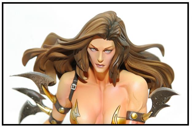 PACKAGING: The statue comes beautifully packaged in a massive window box which shows the individual pieces ready to be put together to form this elaborate and gorgeous warrior woman. The individual pieces are held securely in place by a pre-formed plastic sheet and are surrounded by individual pieces of plastic to ensure paint smears do not occur.