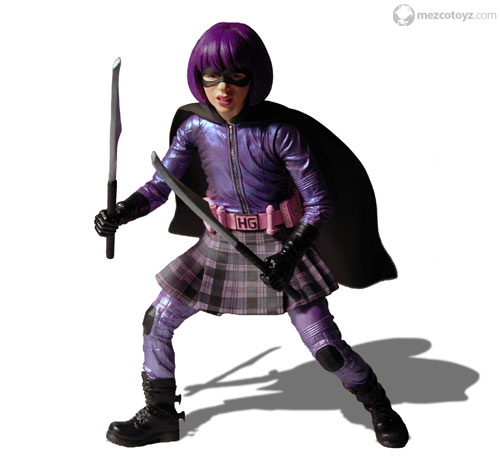 The 1/12 scale action figure features Hit-Girl in her signature plaid skirt, purple wig and cape. Armed with a pair of butterfly knives, and her double Gitano bladed mindy stick.