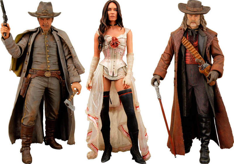 NECA provides further details and images of their upcoming line of Jonah Hex movie collectibles due to hit stores next month. These include a series of 7-inch scale action figures (pictured top). The assortment will consist of Jonah Hex, Leila and Quentin Turnbull. Jonah comes with a pistol, his tomahawk, and a removable hat. Quentin features his cane, a pistol and removable hat and mask, and Leila comes with a pistol.