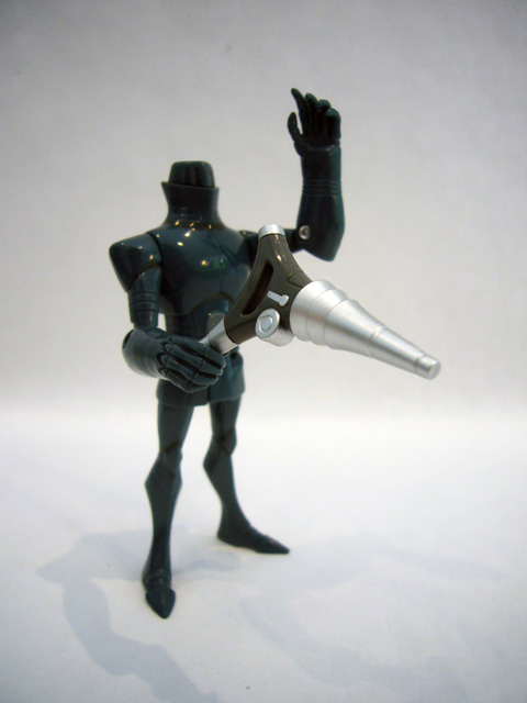 The Forever Knight is only articulated at the shoulders, elbows, and hips, which doesn’t give him a huge range of motion. Upper body poseability isn't too bad, and he looks good in "at attention" or menacing poses. The Knight comes with one accessory, a high tech blaster-type weapon that was included with the previous version as well as the single-carded Kevin Levin figure. The gun is very alien looking, with a triangular main body and conical muzzle. The Knight can hold the gun in his right hand, by the center grip or the bottom protrusion.