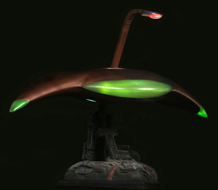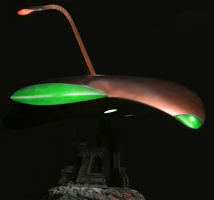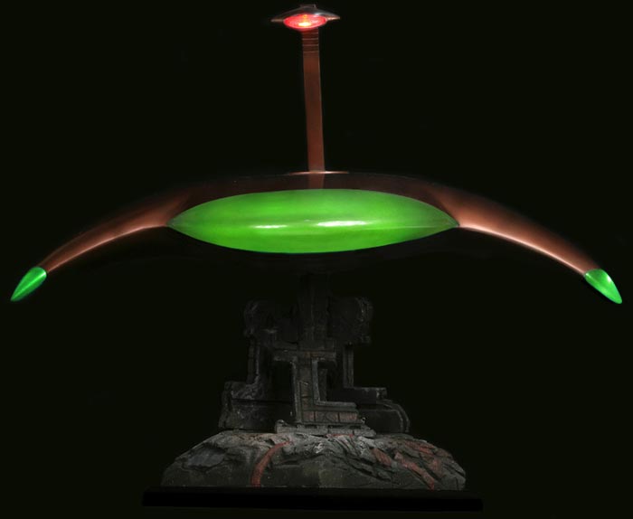 This officially licensed large-scale model from Hollywood Collectibles Group measures a full 20" across its wingtips, and has working lights as seen in the movie, including the pulsating red "Cobra's Head" heat ray. It comes complete with a highly detailed display base depicting the charred ruins of one of the buildings it has destroyed. This replica is constructed from mixed media and then hand painted to the finest detail.