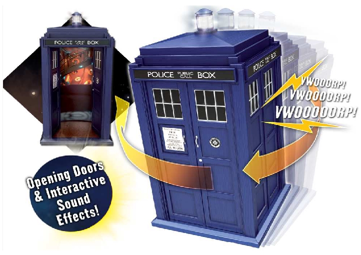 Now you can control your very own TARDIS with this 9" electronic TARDIS which is in scale with the Doctor Who action figure range. It includes eight motion activated interactive sound effects, flashing TARDIS Lantern, opening front doors and telephone door. Requires 3 x AAA batteries. Arriving this July.