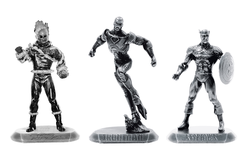 Set #1, pictured above, features Thor, Spider-man, and Silver Surfer. Set #2, pictured below, stars Iron Man, Ghost Rider, and Captain America.