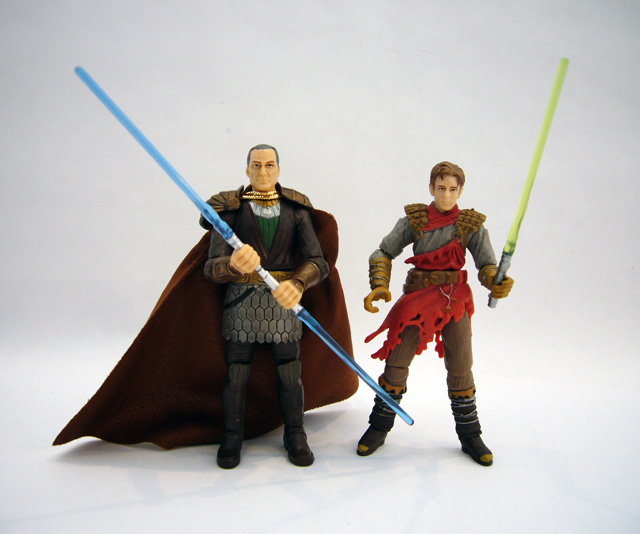 While Exar is the staid old man in this set, Ulic is the scruffy-looking youth. Appearing as young as Kun is old, Qel-Droma is relatively shrimpy at three and a half inches tall. He has a really fantastic sculpt with an almost bizarre array of clothing elements.