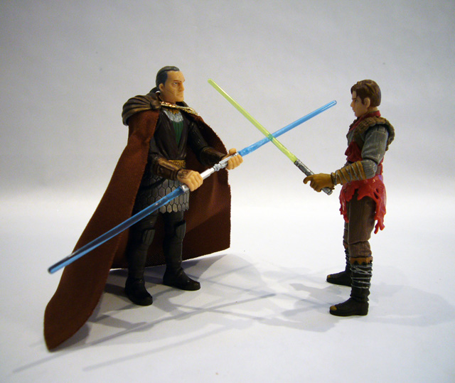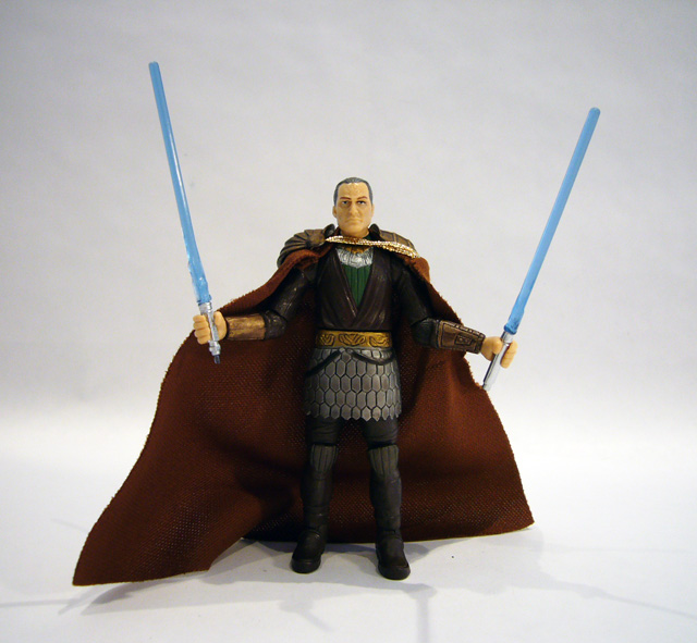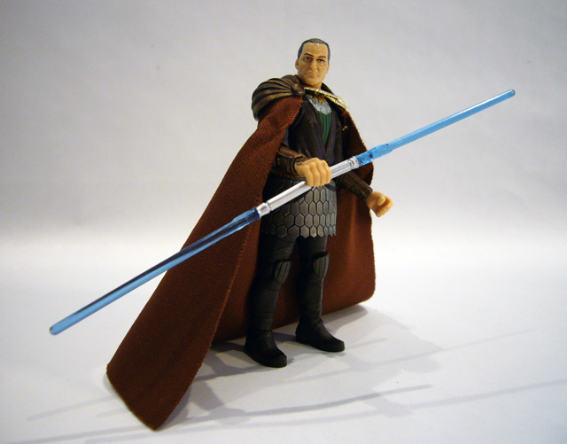 Exar Kun has great articulation with joints at the neck, ball-jointed shoulders, ball-jointed elbows, waist, hips, ball-jointed knees, and ball-jointed ankles. He has a handful of accessories including a long brown soft goods cloak complete with gold neck strap, shoulder pad piece that plugs into a hole in his back, and two fairly nondescript blue lightsabers that connect at the hilts to form the character's trademark double-bladed lightsaber.