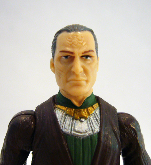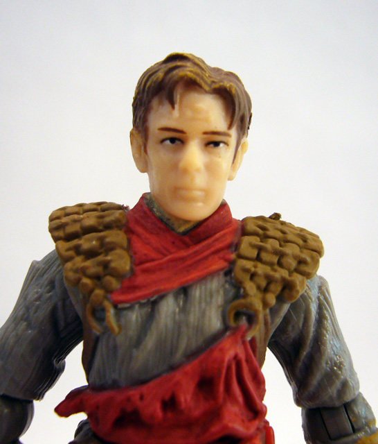 Kun stands at right about 3 ¾ inches, and has a very good sculpt. There was a lot of attention paid to the variations in clothing, with different textures on different parts. The jacket and pants have general creases, while his shirt is vertically lined and the kilt covered in a hexagonal pattern. There is a bunch of great little details all around, like the patterned belt, knee pads, ornate necklace, gauntlet designs, etc. While it's a bit old for my liking, Exar's head sculpt is really good. There’s a lot of personality there with sharp features, furrowed brow, and frowning mouth. There are also two crucial features that were correctly captured on this figure: his forehead Sith brand and the triple scars across his right cheek.