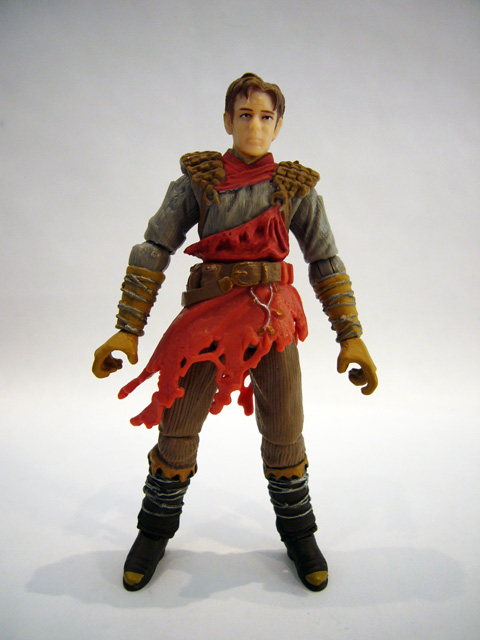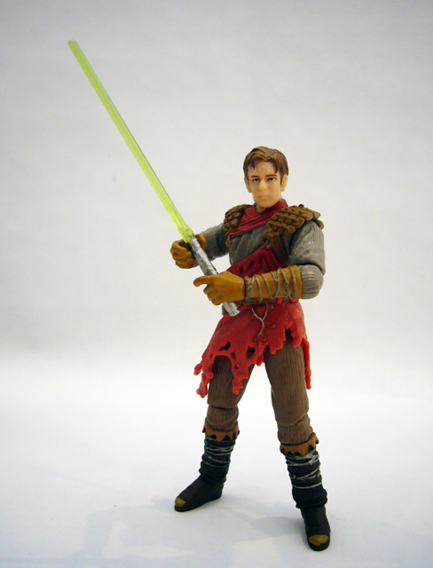 Ulic Qel-Droma's excellent sculpt is matched by a solid paint job, done mainly in earth tones (though warmer than Exar's palette). The former Jedi's shirt and pants are light gray and brown respectively, with a lighter brown on his gloves and boots, which also have a darker shade. The wrapping on both is light silver. Ulic's collar piece and belt are painted brown with details in gold and silver, while what’s left of the outer cloak or robe is bright red. The newly minted Sith Lord has dark eyes and light brown hair with lighter accents. His articulation matches that of Exar Kun's, and he comes with a simple blue-bladed lightsaber.