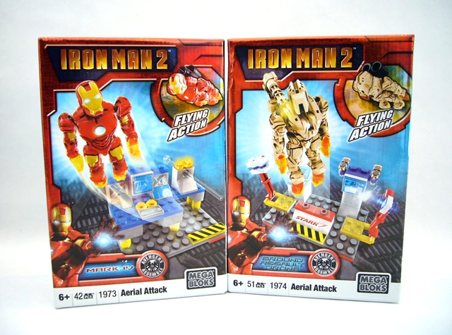 Mega Bloks has been steadily growing in the constructible toy aisle over the last decade or so, with some really incredible and fun lines. Lately, they've been gobbling up major licenses, leading to even bigger and better things like HALO, and finally Iron Man 2! To celebrate the recent release of the blockbuster film Mega Bloks has put out a strong line of Iron Man sets in various sizes and price points. Today we're going to take a look at the "Aerial Attack" series, two sets that include a highly articulated mini-figure, base, and a new flying apparatus that kids will absolutely love!