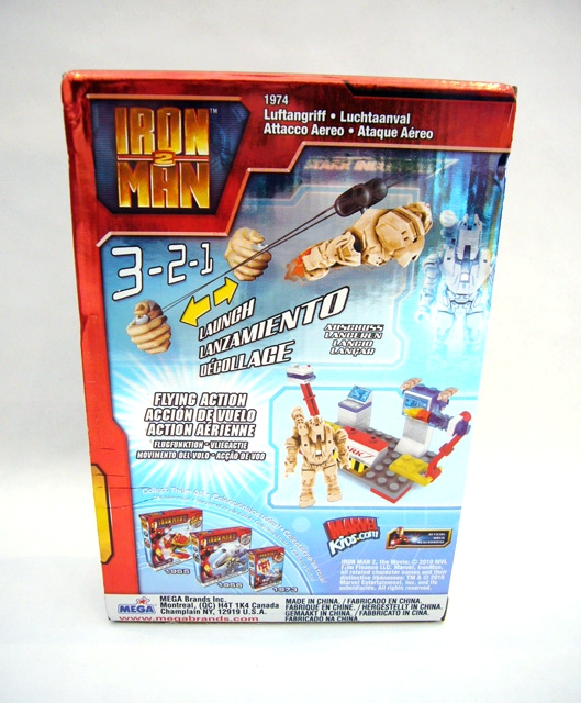 The backs of the boxes continue the dynamic imagery with more shots of the built sets and the figures flying through the air. Finally, there is a handy "Collect Them All" section showing the three basic sizes of Iron Man 2 Mega Bloks sets.