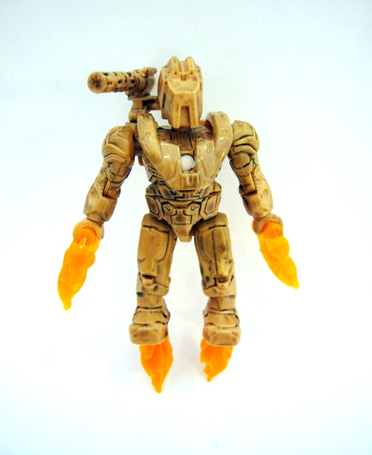 The Drone, meanwhile, is a military tan color with subtle gradations of black to liven it up. That figure too has a white chest circle. Iron Man has no specific figure accessories except for the "flying parts, while the Drone has the same shoulder rig and gatling cannon that War Machine uses. It settles around the figure's shoulders and plugs into the hole in its back, while the gun fits into either post behind its shoulders.