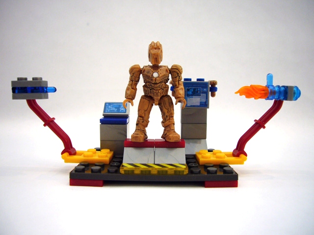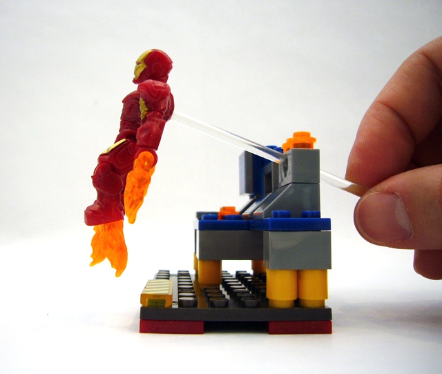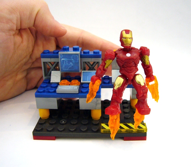 Meanwhile, Iron Man tests out his armor's capabilities at his own computer station decked out with terminal and experiment area. Again, stickers used on the computer screens and keyboard are great. This time, the figure stands in front of a small tower through which a clear plastic rod is inserted into Iron Man's back. By moving the end of the rod you can "test" Iron Man’s flight systems in his own lab!