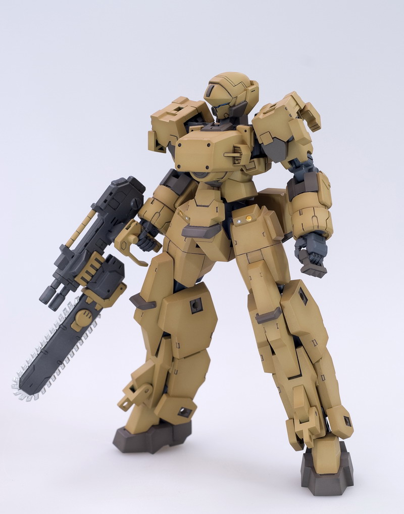Continuing the "main battle tank" motif, the TYPE32 MODEL5 ZENNRAI (pictured below), a special "booster pack" version of the original Gou-Rai robot, mounts imposing heavy armor and tank treads. The frame features approximately 30 points of articulation, even with the added components. The Zennrai's upgraded and expanded arsenal includes the FA/CH-13 "Chainsaw Unit," LN-13 "Laser Bayonet," DBG-13 "Double Barrel Balkan," and an exclusive bonus head. Standing over 6 inches tall, the robot is comprised of approximately 180 parts.