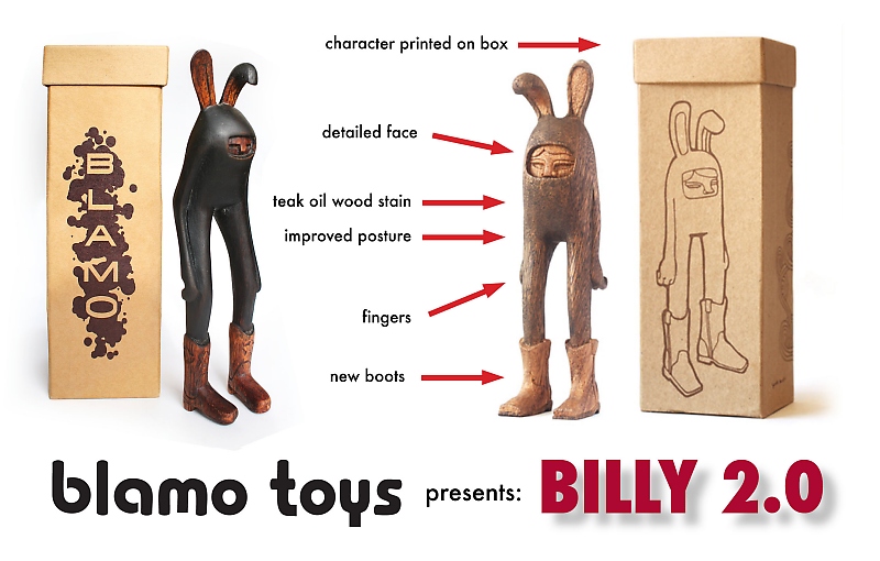 Like the original Billy figure, Billy 2.0 is made from hand carved and stained Suar wood, and stands approximately 7" tall. Billy 2.0 will be available through Blamotoys.com starting Tuesday 6/22/10 and will cost: $80 + shipping.
