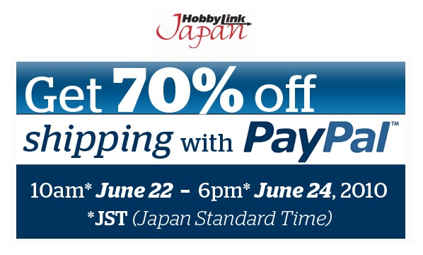 HobbyLinkJapan.com is offering 70% Off Shipping with PayPal! This limited time offer will run from 10am June 22 to 6pm June 24, 2010 (Japan Standard Time; GMT+9), and is only available on in-stock and shippable items.