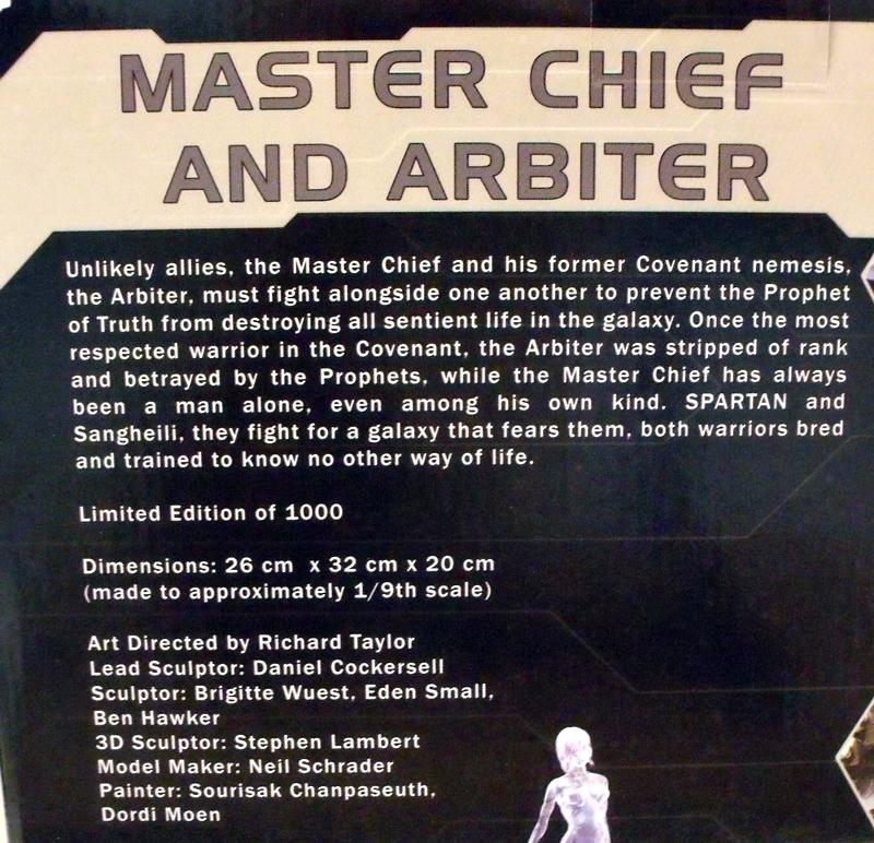 OVERALL IMPRESSION: Bungie's Halo universe is extremely engaging sci-fi material; a fictional world that has expanded way beyond polygons and pixels into a full-blown pop culture phenomenon. Quailty collectibles like the Master Chief and Arbiter statue honor Halo as art. Pieces like this weren't just created for Halo fans, they were lovingly created BY Halo fans... and Weta is about as big a Halo fan as you get (Heck, they made their very own fully functional Warthog). If you are looking for a fitting tribute to two Halo legends, look no further then the Master Chief and Arbiter statue.