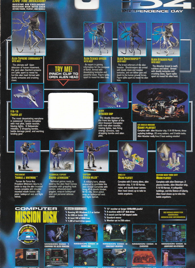 Also had to love the bonus "Mission Disk" included with each figure. While gimmicky for the time, it is beyond nostalgic cool to revist these 3.5" floppy disks all these years later. Yes, I still have a fully functional ID4 disk, which believe it or not, I still have a computer that can read them. Just look at those system requirements!