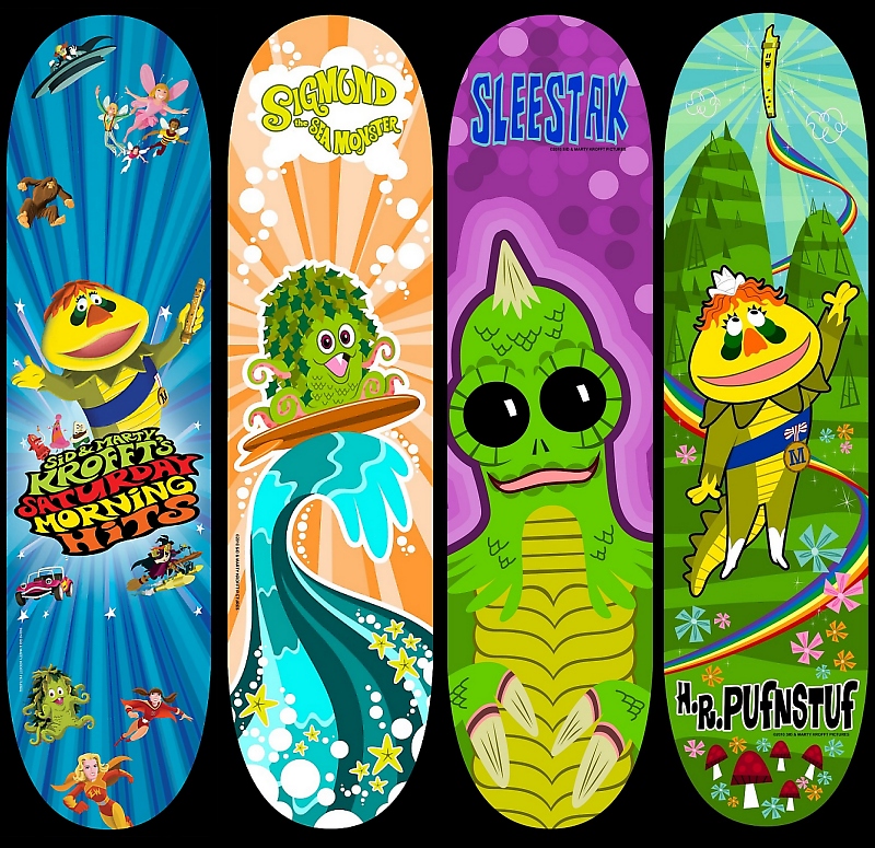 Huckleberry will also be releasing an exclusive line of signed and numbered skateboard decks depicting HR Pufnstuf, Sigmund the Sea Monster, a Sleestak and various Krofft characters. The skateboard decks are made from 7 ply Canadian Maple, measure 8" x 32" and will be made in editions no larger than 50 pieces, depending on the deck design. All the decks will be pre-signed and numbered by Sid & Marty Krofft and carry a price of $65.