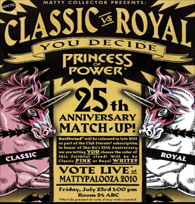 Mattel has posted the above flyer announcing that there will be a Masters of the Universe Classics fan poll at their San Diego Comic-Con Mattypoolza event. The voting at the event will decide whether their upcoming Swiftwind, a Princess of Power stead, will be released in pink or white. The voting will take place live on July 23rd at 1PM in Room 24 ABC.