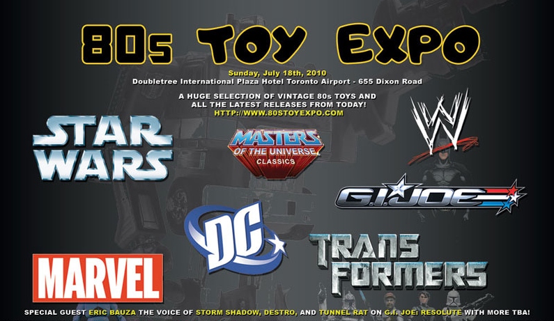 The 2010 Canadian 80s Toy Expo will be July 18th, 2010 at the Doubletree International Plaza Hotel Toronto Airport, 655 Dixon Road, Toronto, Ontario. The show features dealers selling GI Joe (vintage and modern), Transformers (vintage and Japanese imports), Star Wars (new and vintage), Super Heroes (Marvel, DC etc), Wrestling, Masters of the Universe Classics and tons of other action figures and collectibles.