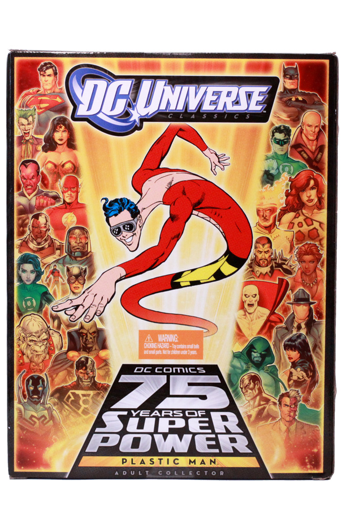 Plastic Man the action figure comes on the usual card and bubble much like the other DC Universe Classics but its design is entirely unique to him. The familiar goggles are heavily featured on the bubble while the card backing itself resembles his outfit and belt. Protecting the card and bubble is a unique outer shipper box with the "75 Years of DC" design familiar to those collecting the line now. The bonus SDCC accessory comes in a small clear baggy by itself, not different than a McDonald's Happy Meal toy.