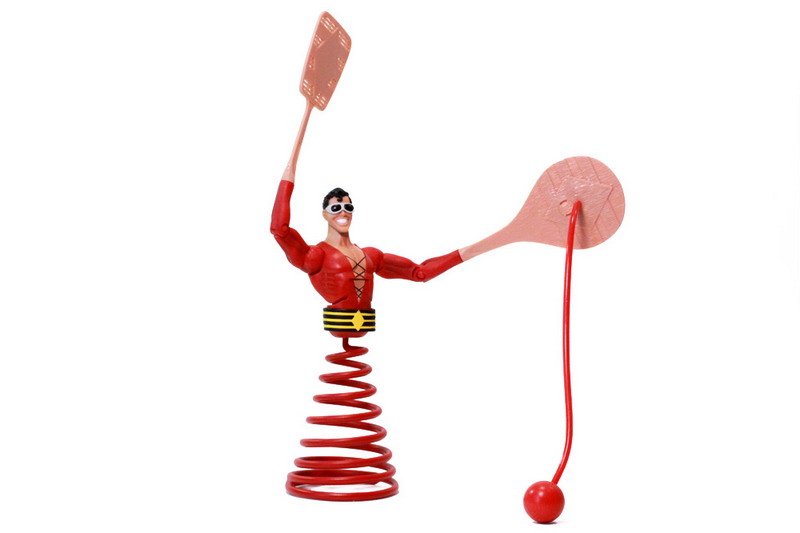 Plastic Man's hands are removable and set as fists. The accessories included can easily be swapped in and out in a variety of combinations. The rubber ball and paddle, as well as a fly swatter, are replacements for hands and there's also completely rubber arms that can be swapped in as well. A button on the back of Plastic Man eases the swapping out of the arms, a good feature to have.