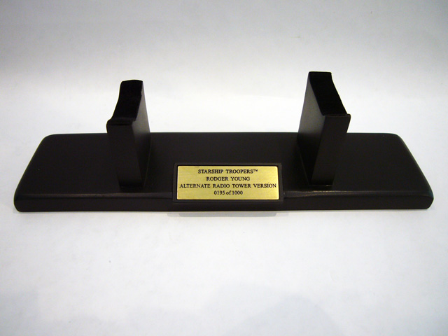 The Rodger Young Alternate Radio Tower Version comes packaged with a black resin display stand with felt cradles for the ship that are shaped and sized to hold it level. There's a metal nameplate on the front with the film title and ship’s name along with the edition number (mine is 195/1000), while the bottom of the base has the film's Tristar copyright information. Because the ship has such a convoluted surface including tiny metal "guns" around its midsection I highly recommend using the base and not putting down the Rodger Young (either version) on a flat surface.