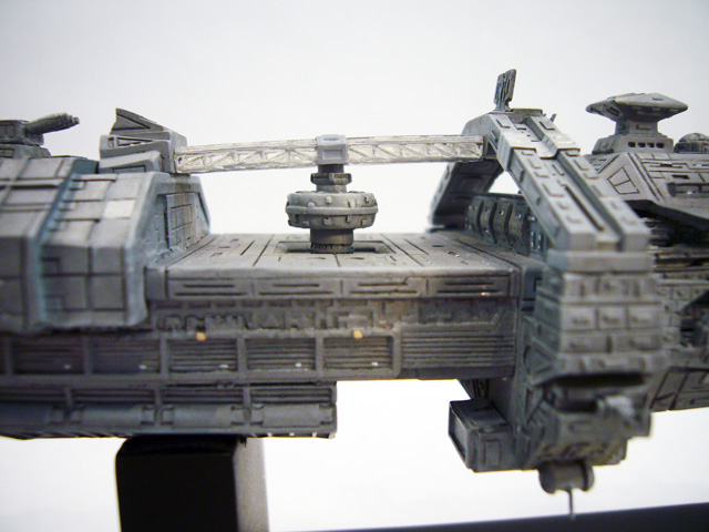 One of the coolest parts is the dorsal section just aft of the bow. In the center of an open area is a round tower that anchors a flying bridge linking the bow to a half ring around the ship's central section. That bridge even has translucent plastic "windows" which look great. Of course, this version is unique for its radio tower design! Rising up from the dorsal side just ahead of the engine section, the original tower consisted of three boxy elements side by side. The new version has the same base, but is topped by a wider structure with angled protrusions on its front and sides.