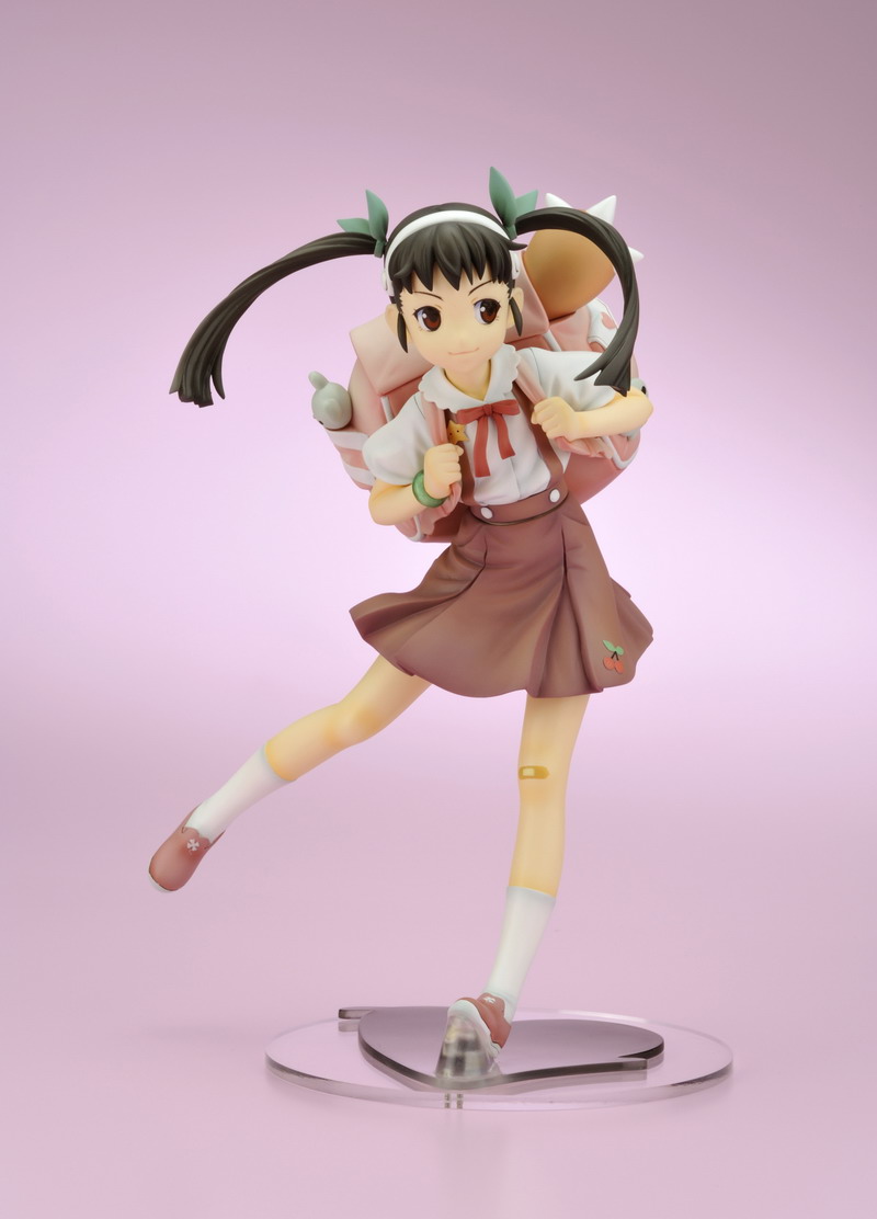 Forever trying to complete her journey to her mother's house, the young girl met up with Koyomi and eventually reached her destination. Always on the move, Mayoi trudges along determinedly, clutching the straps to her plush animal-inspired overstuffed backpack. She wears a school girl outfit with a white short-sleeved shirt, bowtie, high socks, and a pink suspendered skirt with matching shoes. Mayoi has lots of unique details including a bandage on her knee, embroidered cherries on her skirt, a bracelet, headband, and leafy hair decorations. While her whole body is in motion, the ghost girl stares straight ahead toward her destination, a slight smile on her lips.