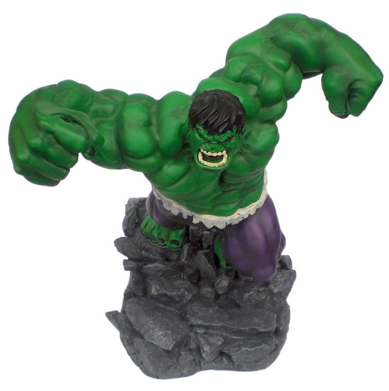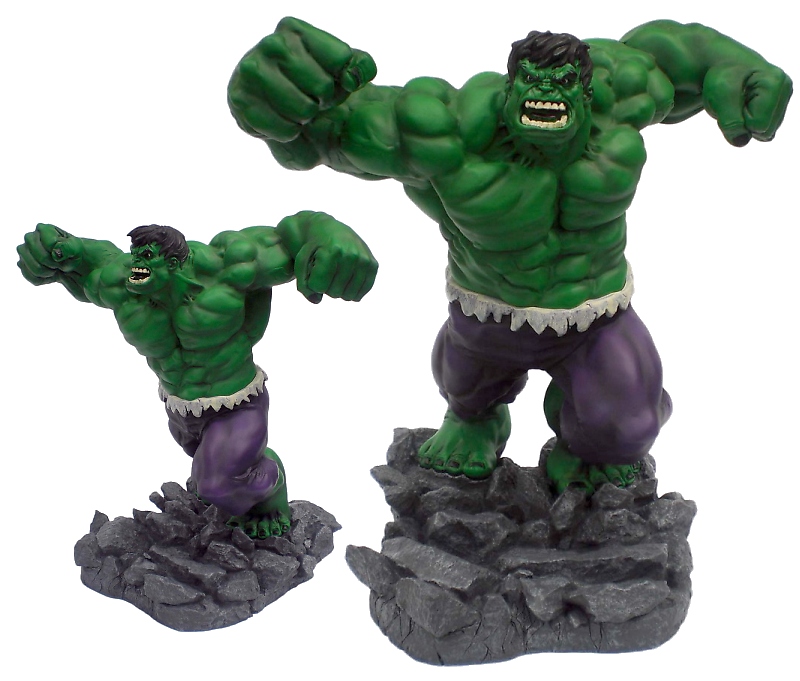 The big green behemoth measures approximately 13 inches in height from base to the top of his head; conveniently fitting inside most curio cabinets or shelving units. The facial expression on the piece depicts traits of both raging anger and rabid insanity which characterizes the Hulk's fierce and volatile nature. The statue stands a top a realistic mountainous terrain base which is crumbling beneath the green behemoth's feet.