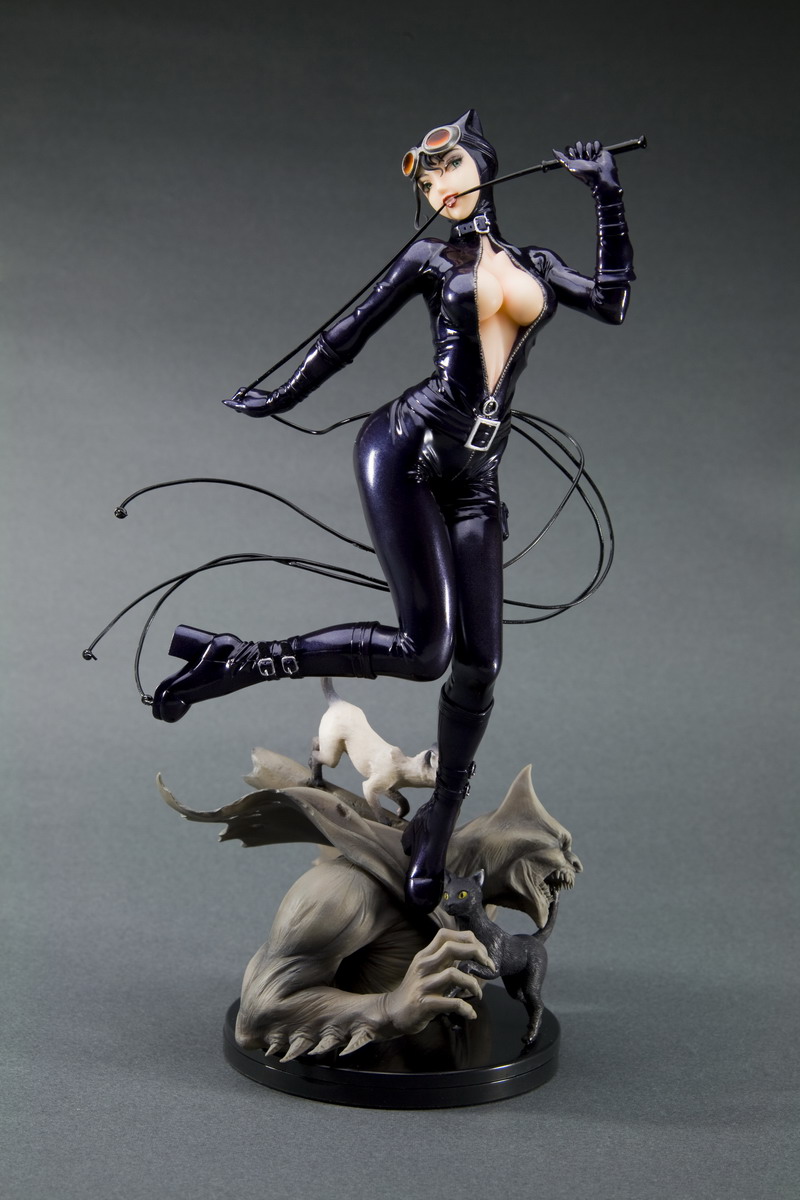 Catwoman is constructed of high-quality PVC plastic and stands approximately 9 1/10 inches tall (in an increased 1/7 scale for DC X Bishoujo statues) atop an exclusive Gotham City Batman-inspired gargoyle base complete with two miniature cats.