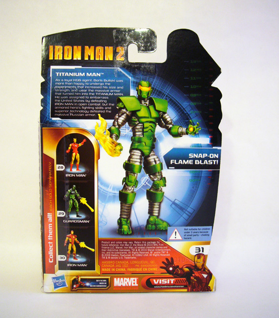 With many figures in the line thus far, Hasbro still uses the exact same package design for each one. From the prominent hero's image at the top of the card to the blockbuster film's logo, it's pretty obvious that these are Iron Man figures. Titanium Man comes straight out of the comic books, and so his figure is marked with the "Comic Series" tag. Through the bubble you can see the figure clearly, as well as his one accessory and the typical display base with three armor cards. The back of the card has the aforementioned bio along with a large photo of the figure and cross-promotion for Guardsman, Iron Man 28 and Iron Man 30.