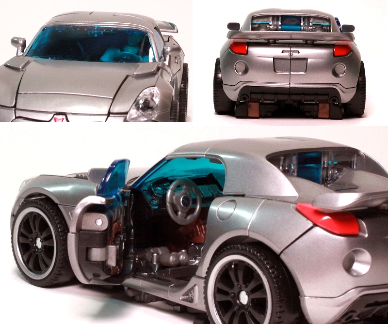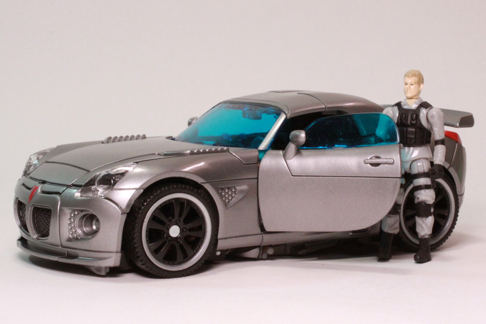 CAR MODE: As previously mentioned, Jazz is the sleek Pontiac Solstice and it's a remarkable representation of it. The plastic in this color is much more attractive than Bumblebee's yellow or Skid's green. The headlights, windshield, and windows are all clear plastic which adds to the authentic look. The doors open up to allow Captain Lennox (or any other human alliance figure) to cozy on in.