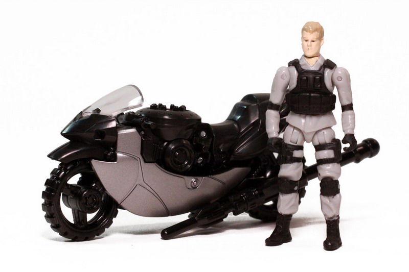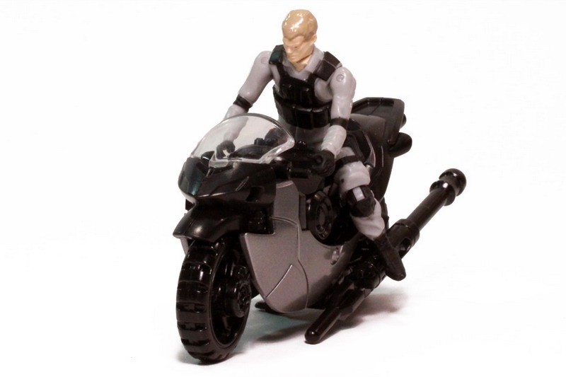 As far as accessories go, the included motorcycle can transform into a shielded blaster weapon that plugs into either arm.