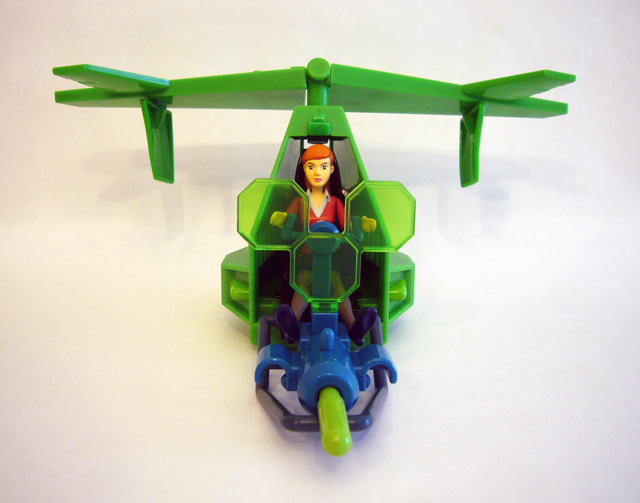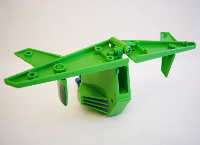 If you've got all three UAV sets, you can combine them to form the Rustbucket III. Gwen's section transforms very easily. Basically, pack in the seat and bar, then fold the rotors together and back to form the tail of the jet. I don't have the other sets yet, but the 'bucket looks pretty cool on the package graphics.