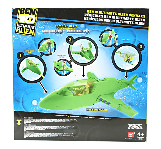 There are three "UAV" sets, and all of them share the same basic package design. Squarish window boxes, these packages show off the contents inside and provide lots of bright and colorful graphics. The front panel has the Ben 10 Ultimate Alien logo in the top left corner, and is vividly colored in blues, greens, and yellows. Surrounding the window are photos showing the toy in action and how it combines with the others in the series. The back of the box follows suit, entirely focusing on the combination aspect to create the Rustbucket III.