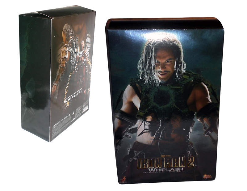 PACKAGING: The first figure in a series of Iron Man 2 1/6th scale figures comes in a metallic-foiled exterior cardboard sleeve. The front of the outer box features a fantastic image of Whiplash from the film that spreads out to the right outer edge of the sleeve. Hot Toys has also cleverly snuck in a teaser image of the upcoming Black Widow figure on the left edge of the box. It would be great if Hot Toys continues this teaser image trend with every other upcoming figure in the series but that is yet to be seen.
