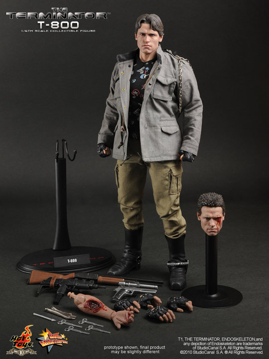 Following yesterday's gruesome teaser image, Hot Toys pulls back the curtain to fully reveal their first figure from The Terminator: Arnold Schwarzenegger as the unstoppable T-800. The figure sports Arnold donning the stolen punk rocker jacker and iconic firearms such as "12-gauge auto-loader," "Uzi nine millimeter," and ".45 long slide, with laser sighting". "Phased plasma rifle in the 40-watt range" not included.