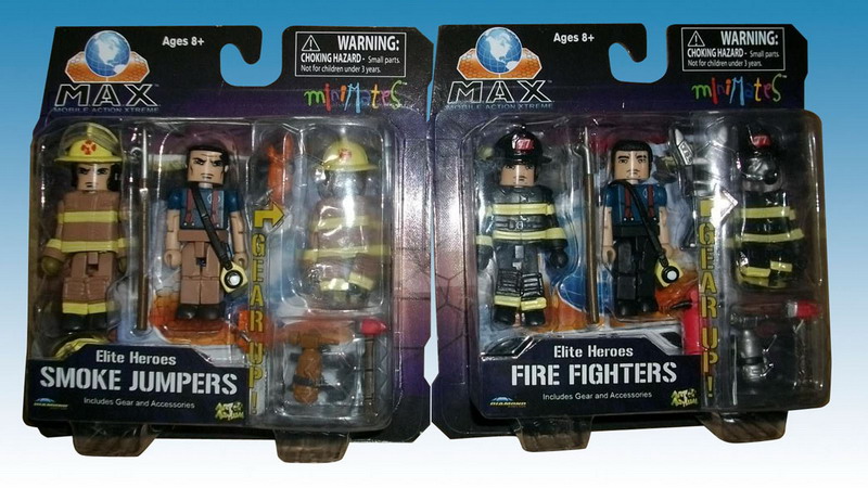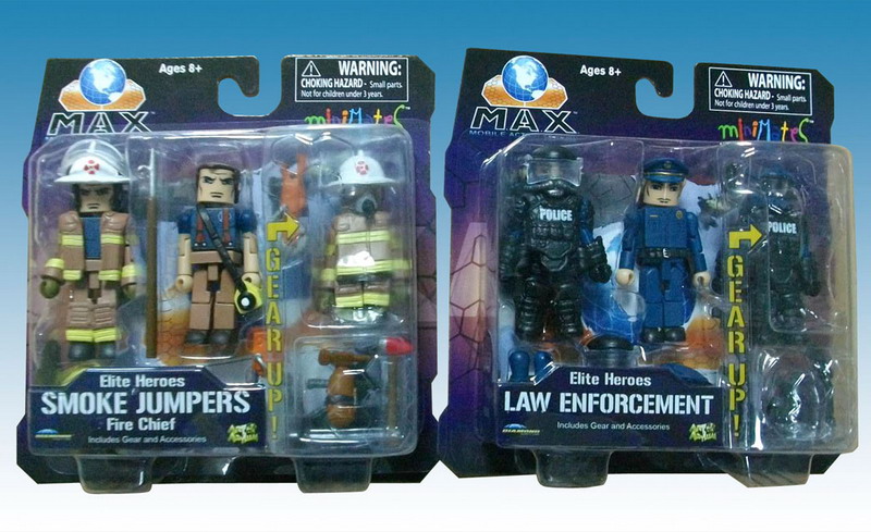 The first wave arriving in stores soon will consist of Firefighters, Smoke Jumpers, Law Enforcement and Special Ops. Pictured are the figures with their accessories packaged as they near production. Select scaled vehicles that can be used with this assortment, including the Minimate M.A.X. Tech Stealth Jet, can be found in Toys"R"Us now.