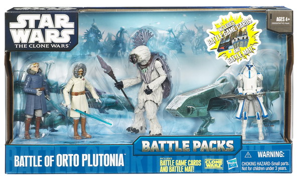 The onslaught of new Star Wars action figures continues this November with three new Battle Packs. New to the sets is the addition of cards and mat for playing the Star Wars Battle Game; an incentive introduced this year with the solo-packed figures. It's a battle in a box! Priced at $29.99- $31.99 each, these adventure-ready box sets include: