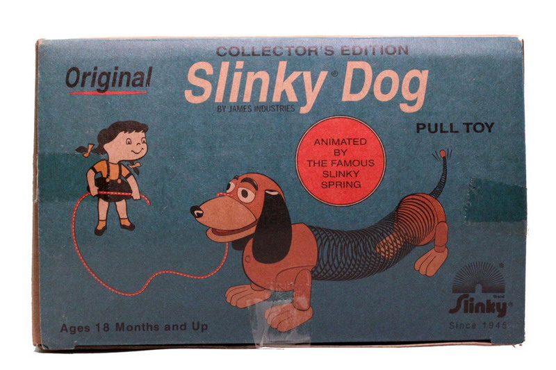 The Collector's Edition Slinky Dog has been recreated in authentic detail down to his quirky leash. Originally placed on his chest, the leash was relocated to his head before production began in 1953 in order to keep his head up while walking. Today, the leash is shorter to comply with federal safety regulations.
