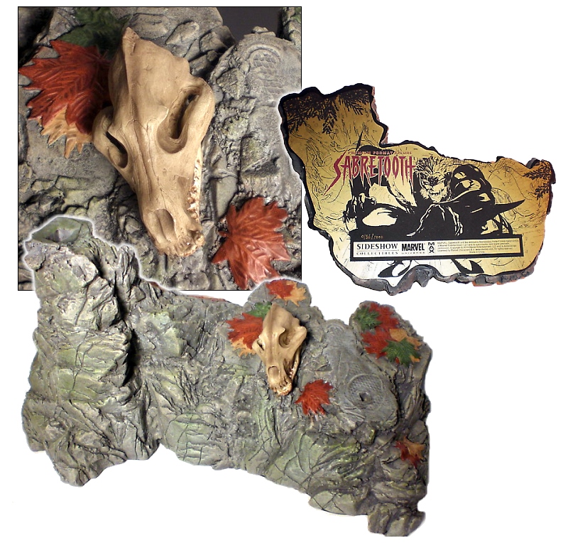 The majority of Sabretooth's body is covered by his fabric costume but the anatomical aspects of his body are represented very well underneath. The statue also includes an environmental display base that resembles a forest environment. The base depicts a rocky formation with red and orange leaves scattered around it. An animal skull sits on top of the stone base giving the impression of remains from one of Sabretooth’s previous victims. The base is beautifully detailed and looks very realistic which significantly enhances the already impressive ¼ scale figure.