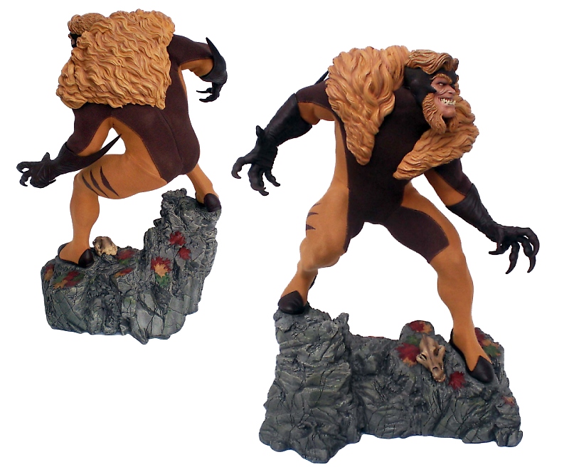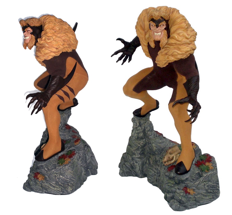 COSTUME/ ACCESSORIES: Sabretooth's fabric costume is accurately tailored around the figure’s hulking physique. The fabric outfit is fabricated very well and creates a vivid contrast on the piece due to the clashing textures of the fabric and polystone. The statue is comprised of four individual parts (base, body, head and arms). The head and arms attach to the body magnetically and the body attaches to the base via two metal rods that hold it in place.