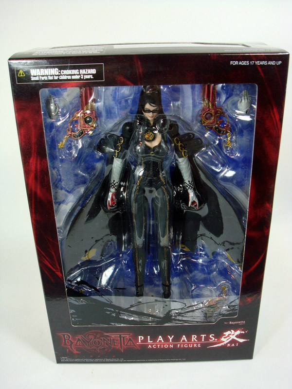The packaging for the Bayonetta figures keeps with the design of the Play Arts Kai figure line with no J-hook and a large window in the front and smaller die-cut windows on the sides. The overall color scheme of the box is red and black with the moon being used as a prominent graphic both on the insert and the back of the package. Both boxes have images of the enclosed figure on the side and well as multiple images on the back of the box. The figures are kept safe and secure on the inside of the box in plastic trays with form-fitting tops.