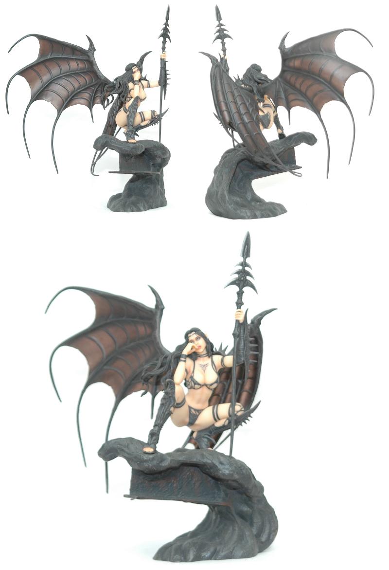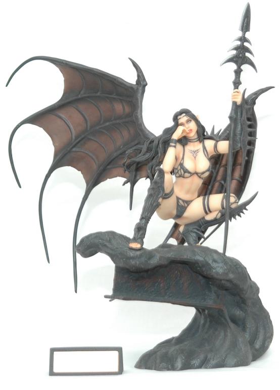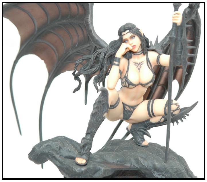 Sculptor Shin Tanabe brings Luis Royo's gorgeous painting to life with skill and artistry. The intricate details seen in the painting - the translucent demonic wings, the massive base, the inquisitive and thought-provoking look upon her face - all are present and captured in this polyresin statue.