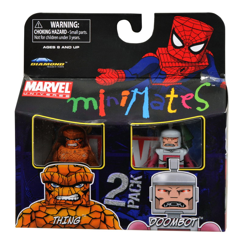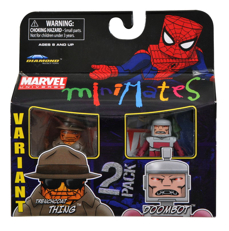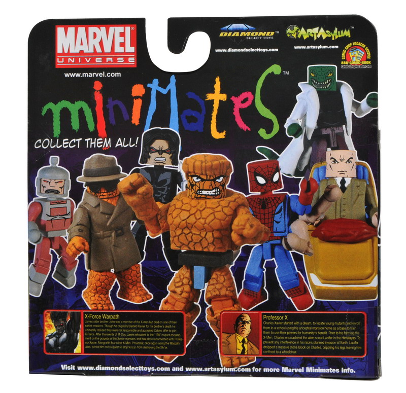 DST also provides a packaged look at Marvel Minimates Series 37, currently shipping to retail. This wave includes 2-packs of Spider-Man and Lizard, Thing with army building Doombot, Thing in his trench coat disguise and Doombot, and Professor Xavier and X-Force Warpath.