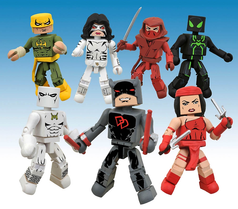 Diamond Select Toys provides a look at Marvel Minimates Series 38 (pictured above) inspired by Marvel Comics' Shadowland comic book series. This assortment features 2-packs of Spider-Man and Iron Fist, Elektra and the new, darker Daredevil, White Tiger and the exclusive Hand Soldier, as well as the short-packed Classic White Tiger to go with the army-building Hand Soldier. Pre-orders are being taken for Series 38 in the December issue of PREVIEWS with the wave arriving in stores in April 2011.