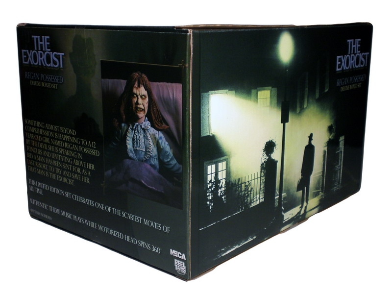 The back of the box features the poster image from the 1973 film along with a mini bio. The right side panel features an image of the hand painted prototype of the possessed Regan. The inside of the box features a removable cardboard diorama of Regan's bedroom with father Merrin at her bedside performing the exorcism.